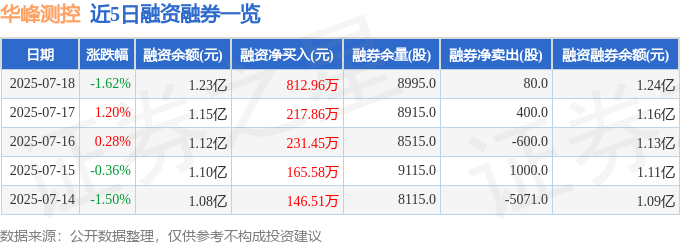 华峰测控融资融券信息显示,融资方面,当日融资买入2267.37万元,融资偿还1454.41万元,融资净买入812.96万元,连续3日净买入累计1262.26万元。融券方面,融券卖出880.0股,融券偿还800.0股,融券余量8995.0股,融券余额120.34万元。融资融券余额1.24亿元。