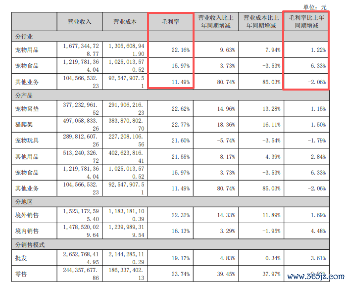 宠物食品和宠物用品的营收占比分别为40.64%和55.88%,毛利率同比分别提升6.33个百分点和1.22个百分点。