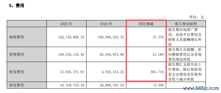 2025年,公司销售费用、管理费用、财务费用增长明显,其中销售费用3.42亿元,同比增长37.37%,公司称主要系市场推广费用、电商平台费用及销售人员薪酬增长所致;管理费用1.1亿元,同比增长31.18%,公司称系人员薪酬、折旧摊销费用以及咨询费用增加所致。