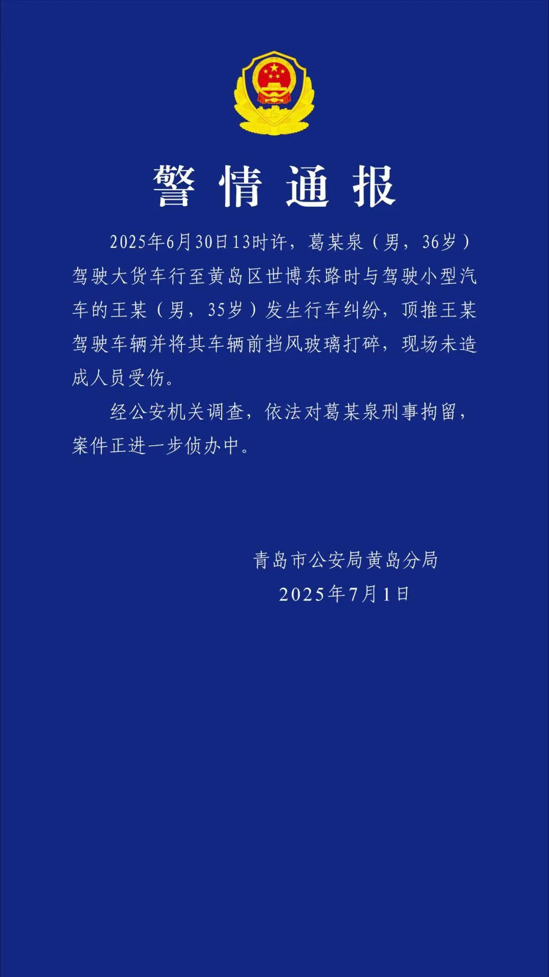 金策宝 青岛黄岛警方通报:葛某泉(男,36岁)驾驶大货车顶推小汽车被刑拘