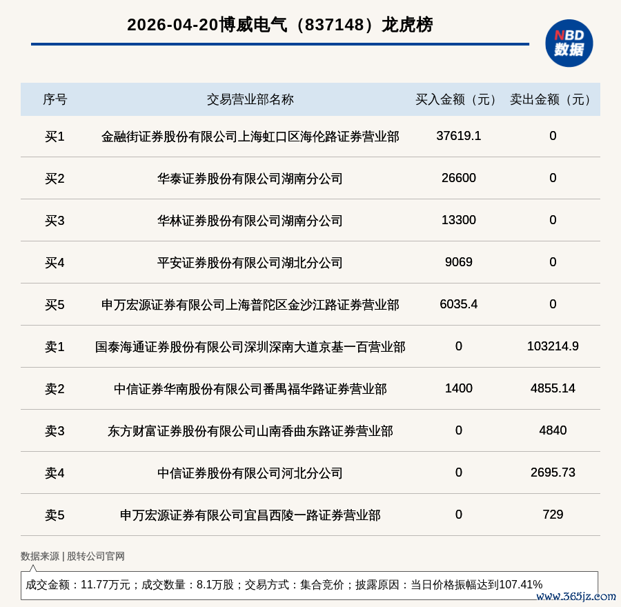 每经讯,2026年4月20日,新三板创新层公司博威电气(837148,收盘价:2.43元)登上龙虎榜,交易方式是集合竞价,披露原因是当日价格振幅达到107.41%,成交数量8.1万股,成交金额11.77万元。买一席位为金融街证券股份有限公司上海虹口区海伦路证券营业部,买入3.76万元;卖一席位为国泰海通证券股份有限公司深圳深南大道京基一百营业部,卖出10.32万元。